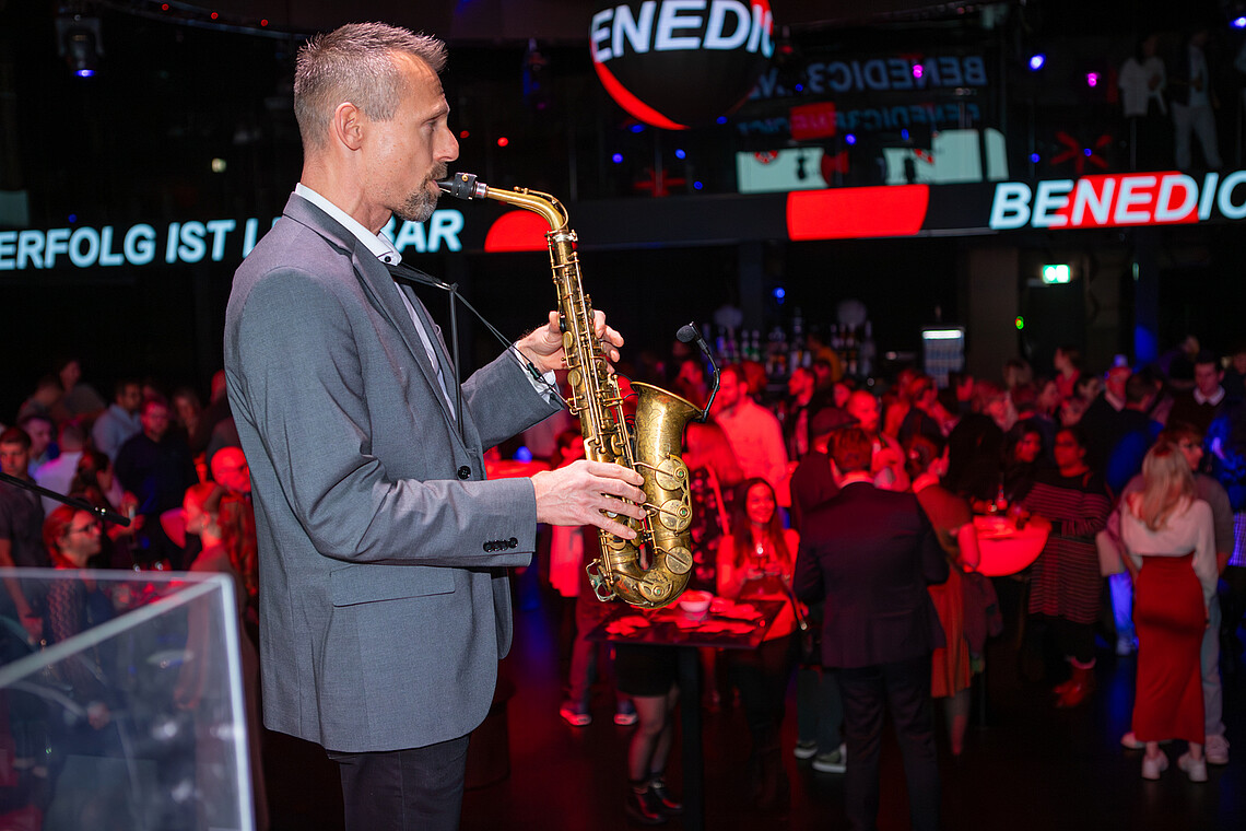 - Die musikalische Begleitung des Abends übernahm der Saxophonist Philipp Gubelmann sax o’ conga.